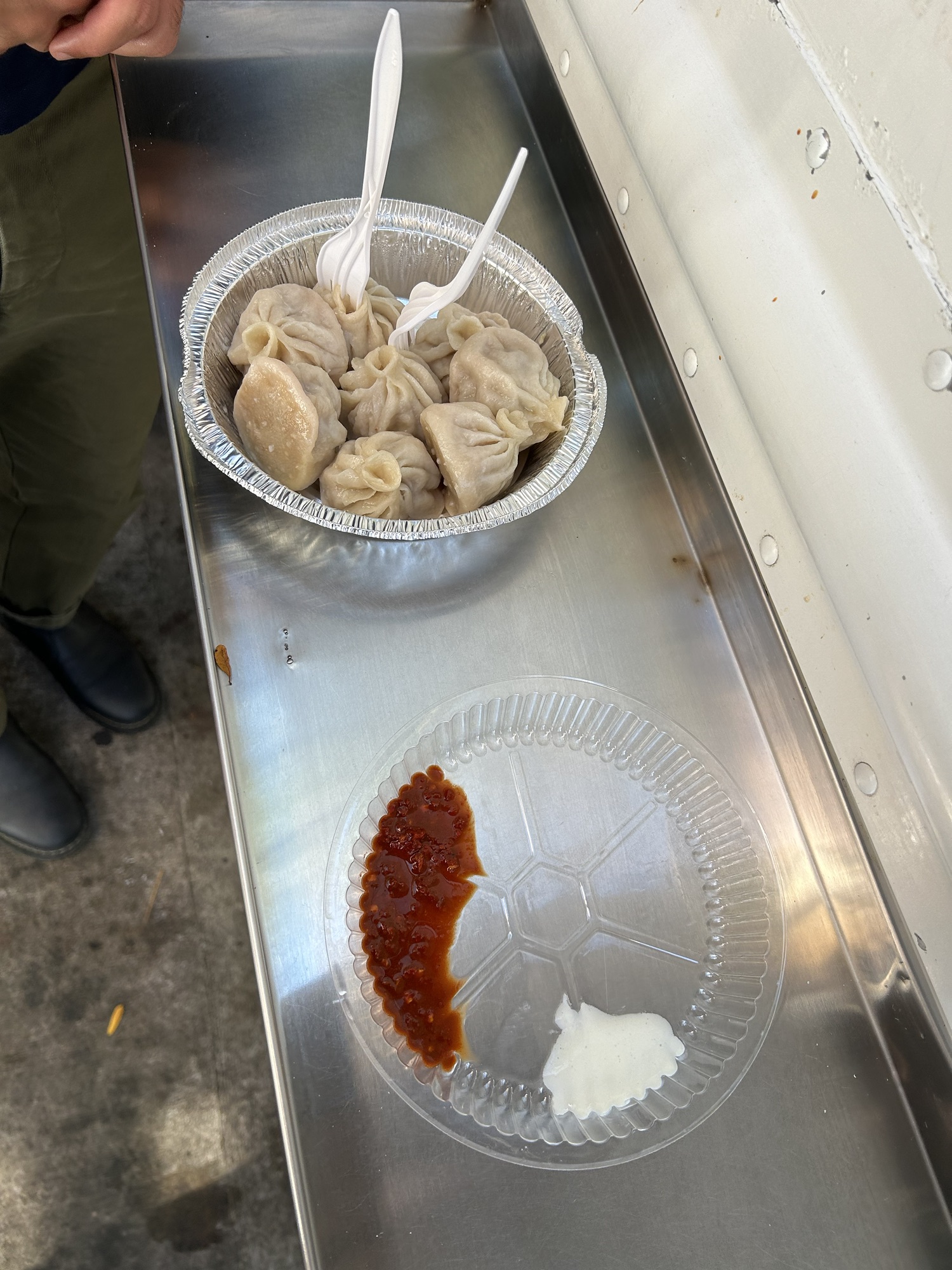 Our first stop was Amdo Kitchen right by the Jackson Heights-Roosevelt Avenue metro station. It served authentic Tibetan momos (i.e. soup dumplings) cooked to demands with two sauces on the side, a spicy sauce made of chili oil and a sort of white sauce. We ordered eight beef momos and stood by as the chef started the steamer to cook the dumplings. As we watched the steam wafting out of the food truck window, our stomachs’ complaints deepened. To lighten the mood, we joked about the “100 frozen momos” on the menu – for a whopping amount of 60 bucks, we could buy a month’s worth of frozen momos, a great deal in today’s inflation rate, but unfortunately we were unable to carry them with us (in case you ever wondered, Tarek eventually went back to get them).