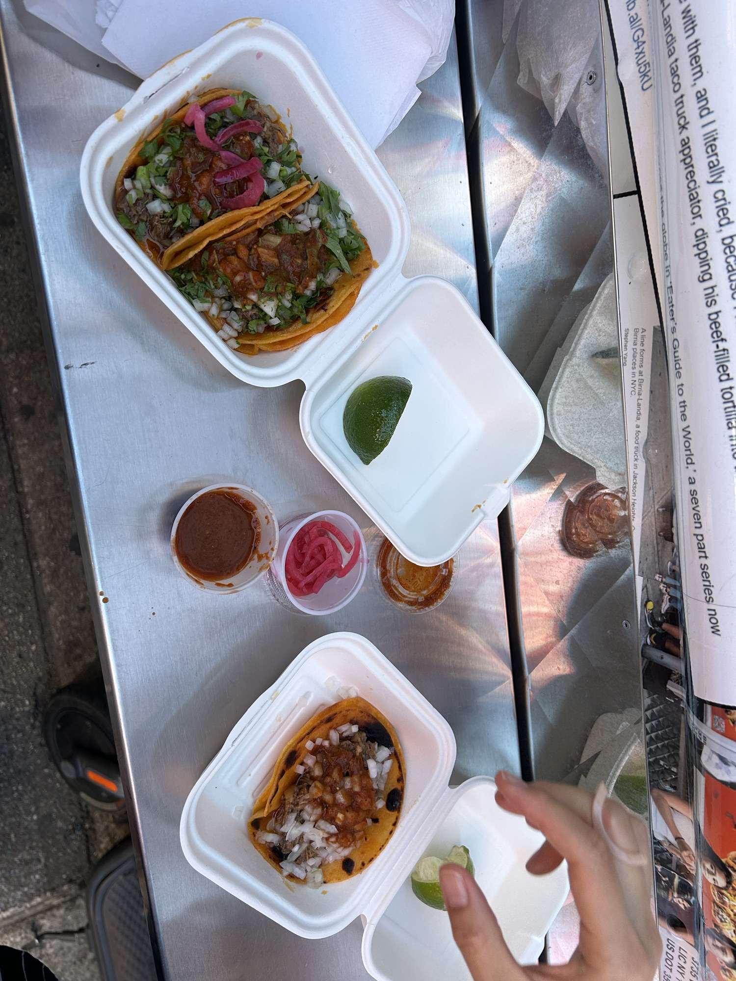Our next stop was the famous birria taco truck Birria Landia. The owners claimed outright that they were the best in town, so much so that they were equipped with one of the biggest food truck I had ever seen, almost twice as long and as large as Amdo Kithen, not to mention that it also looked squeaky clean. To back up their claim, they coated their truck with enlarged snapshots of newspaper articles showcasing their success story, as if size was not the only thing that mattered. We ordered three prized birria tacos, and knowing the ultra-competitive landscape of Mexican food, held onto our skepticism. What could possibly make their tacos truly as outstanding as they have claimed?