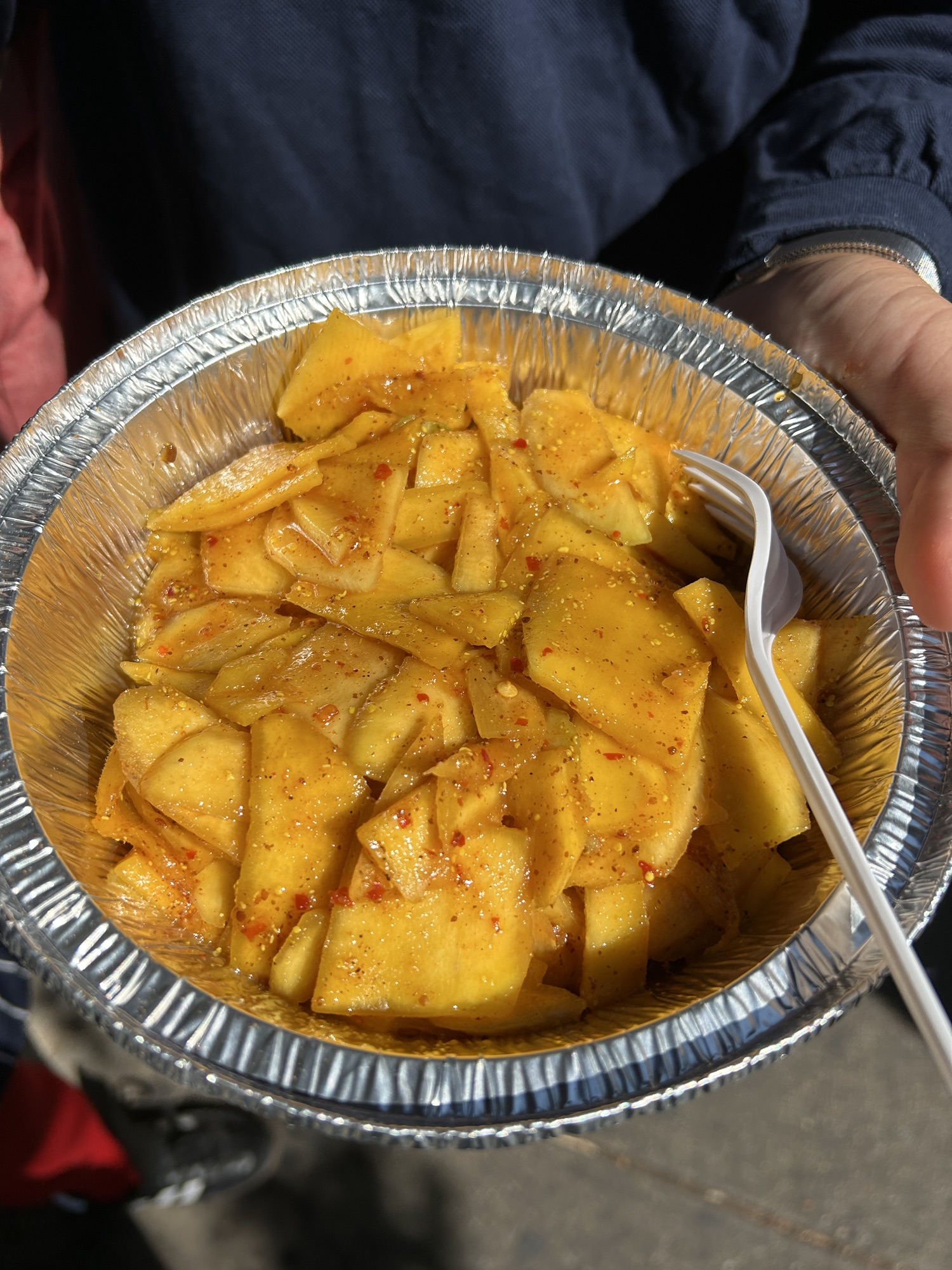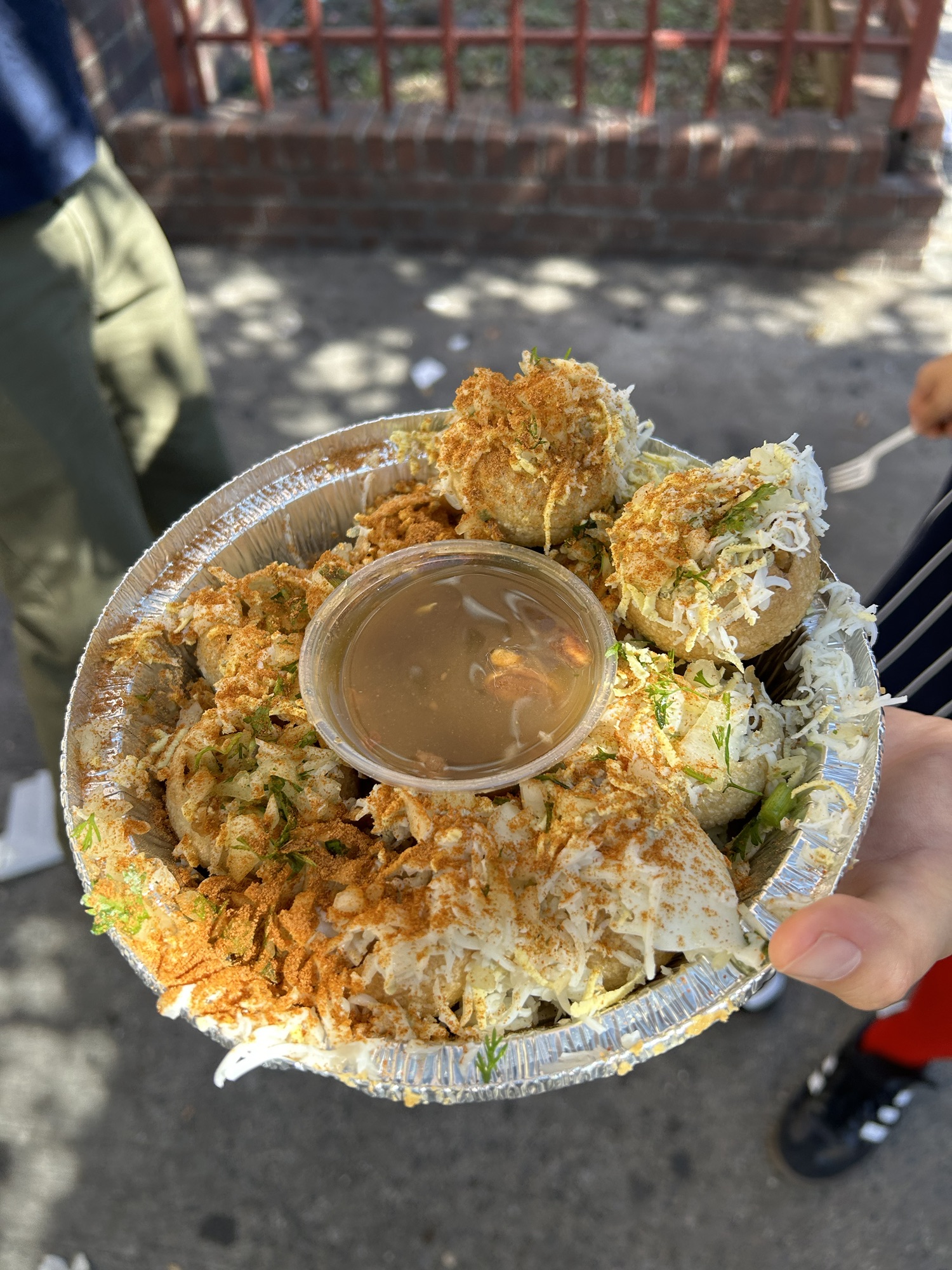 Our next stop was Fuska House, a Bangladeshi food truck known for its Bengali street delights that center on a type of stuffed pastry with a deep-fried shell named Fuska (sometimes spelled Fuchka, also called Pani Puri or Golappa in some parts of India). Fuska House was also featured in The New York Times for its notoriously petty and ostentatious rivalry with another Bangladeshi food truck called Fuska Garden. Their rivalry was such that they would park at the same spot and duel each other on selling the same kind of Bengali street food. The situation has definitely not changed when we arrived. We also saw not one but two Fuska House trucks park on both sides of Fuska Garden. Each had a banner pointing to the owner being the OG. Initially, we thought that one of the two Fuska Houses was a doppelgänger who joined the rivalry and blatantly infringed on the other Fuska House’s trademark rights, but we could not have been more wrong. When we approached the chef in the first Fuska House, he led us straight to the second Fuska House truck to place the order. The whole scheme was about throwing an entire truck there just to sandwich the rival – the top, top level of pettiness. While we were endlessly fascinated by this unheard-of street food strategy by Fuska House and by how their rival truck, Fuska Garden, had survived all this sort of overt bullying, we quickly remembered that our ultimate goal was to try their food, so we purchased two of the famous dishes, the Fuchka (#1 on the menu) and mango chaat.